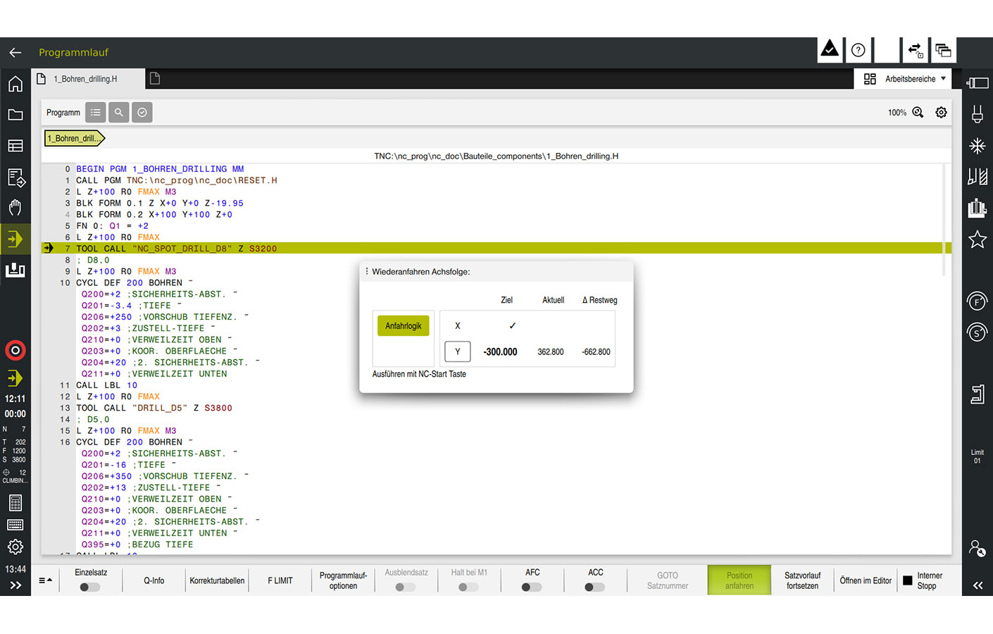 Si vous n'avez pas besoin de poursuivre l'exécution du programme suite à une interruption, la softkey ARRET INTERNE vous permet d'acquitter l'arrêt de la CN. Vous pouvez ensuite changer de mode de fonctionnement et, par exemple, dégager l’outil en mode Manuel, sans toutefois bénéficier du confort que vous apporte l’assistance de la commande. Le réaccostage automatique n’est plus possible dans un premier temps.